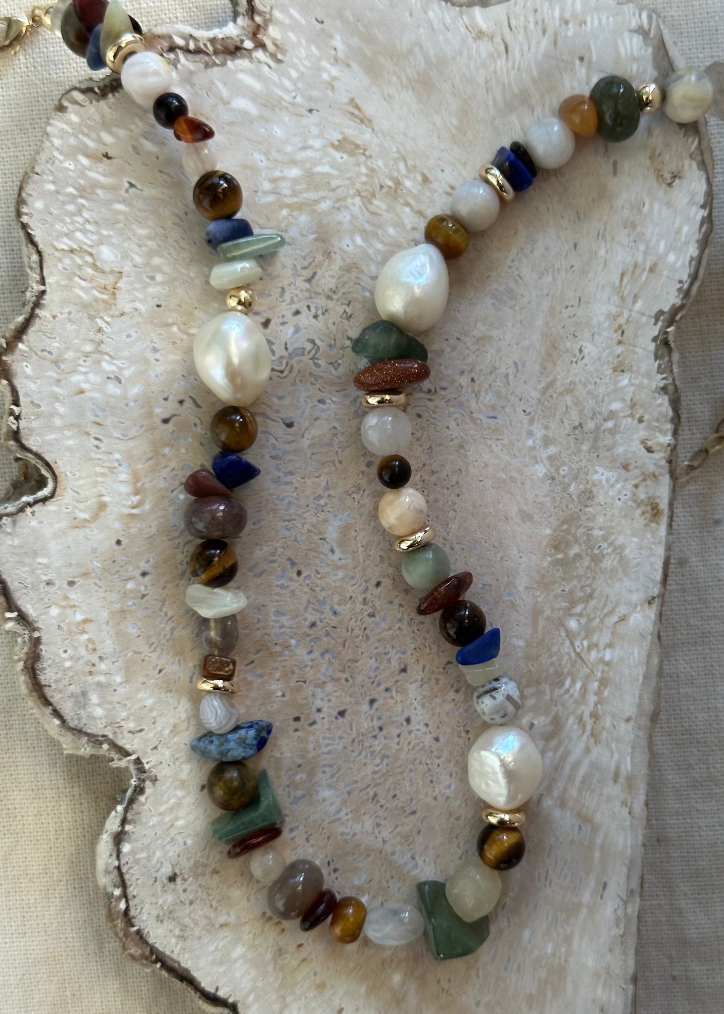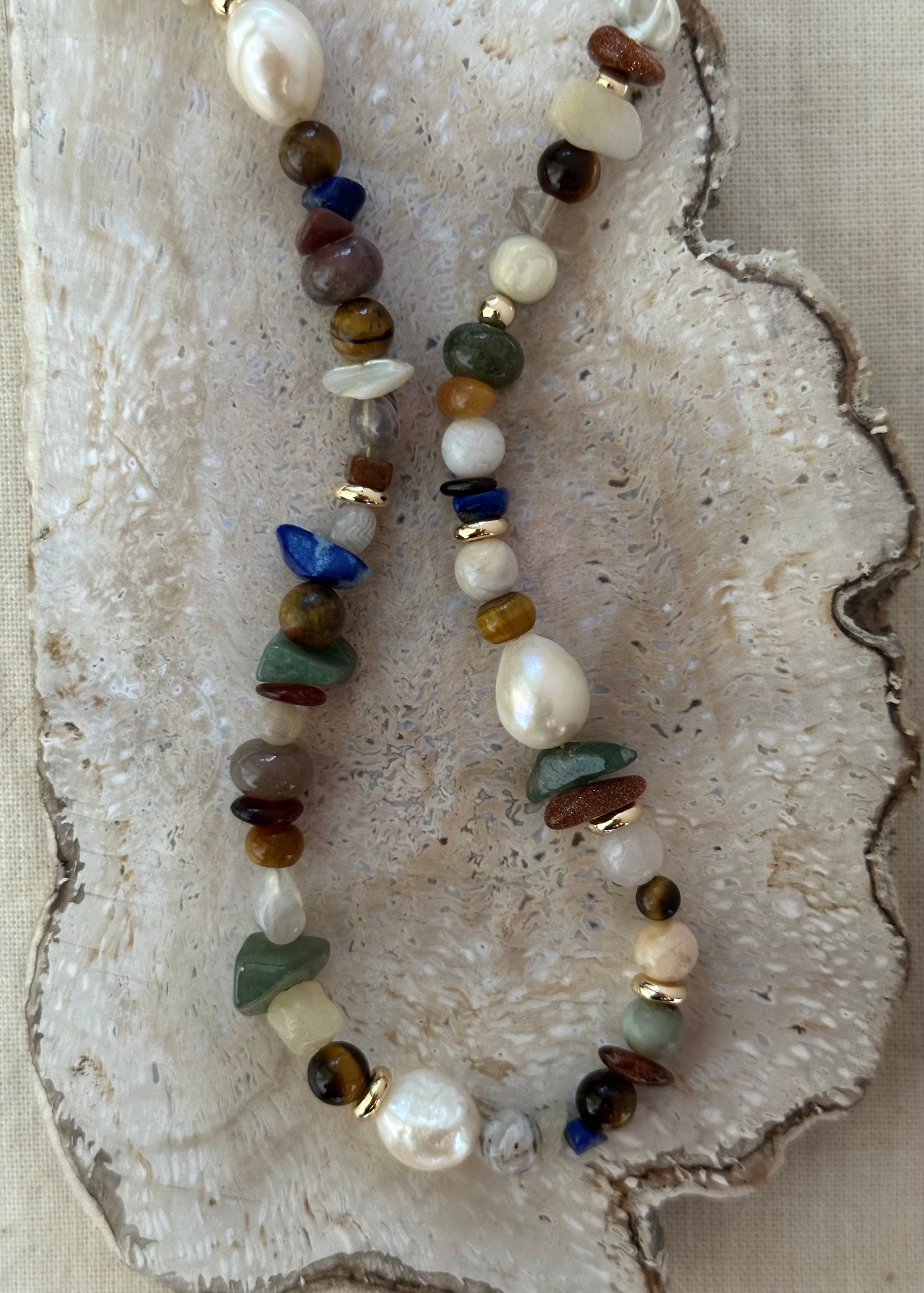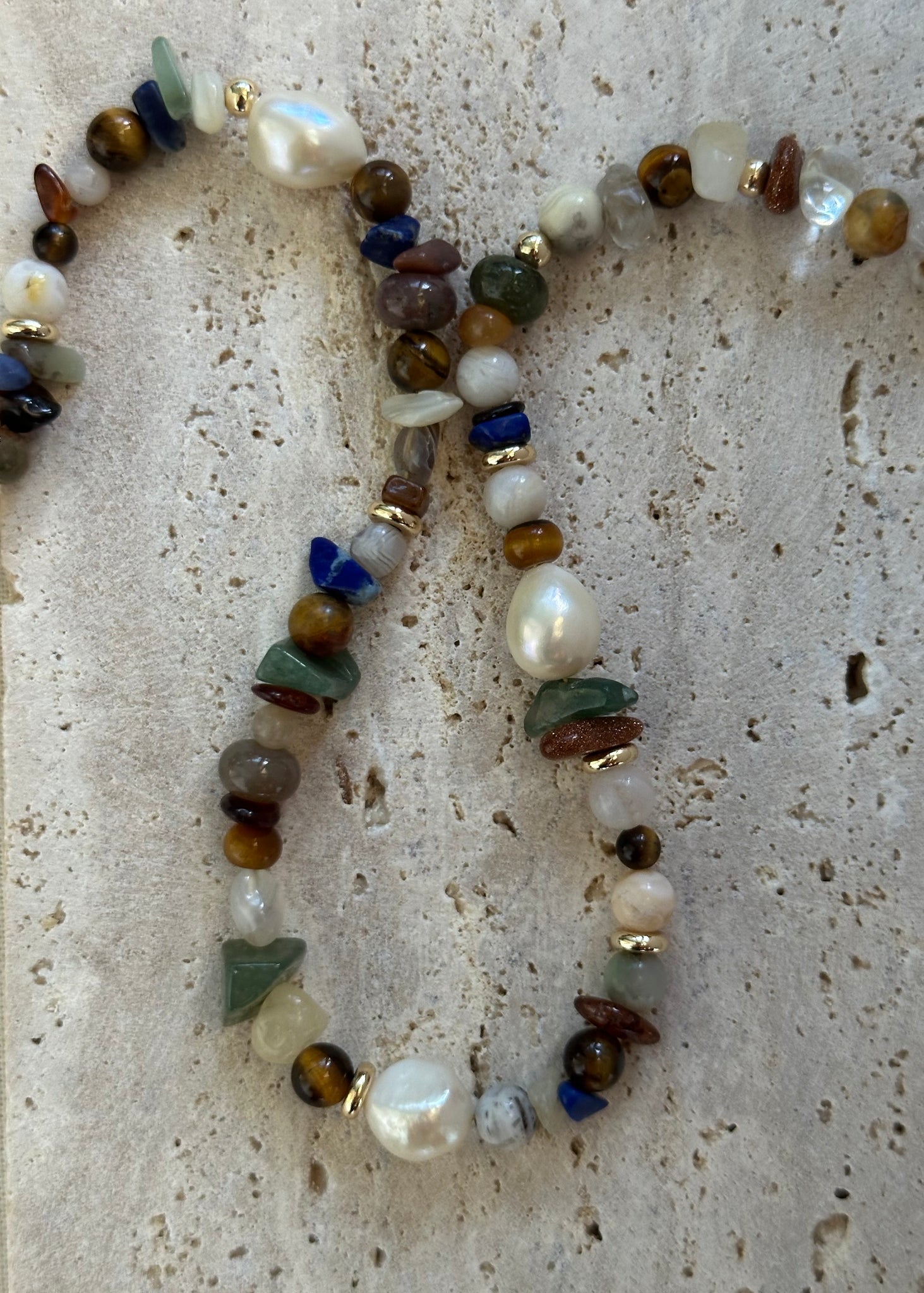 Handmade necklace with natural beads, gemstones and freshwater pearls.