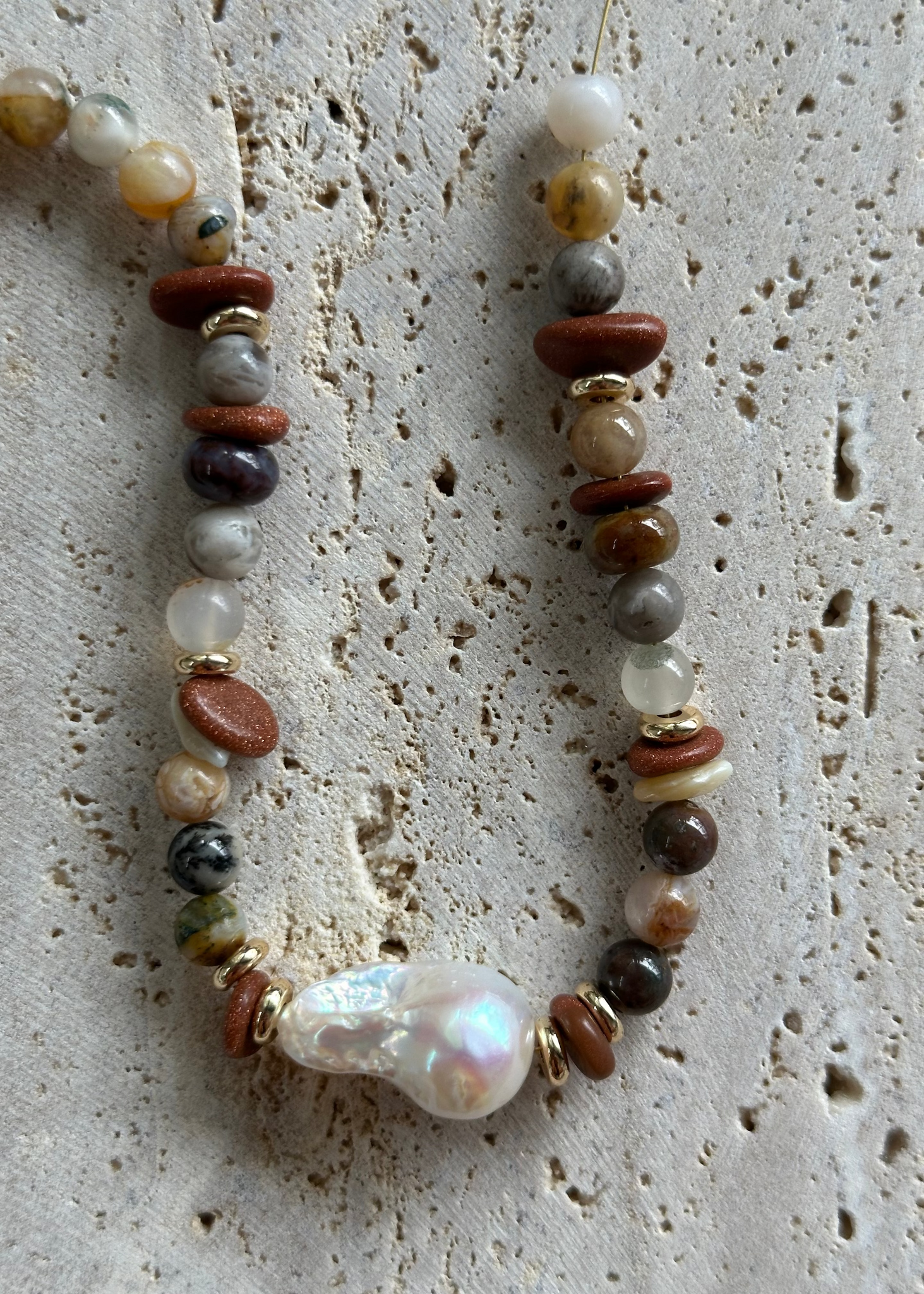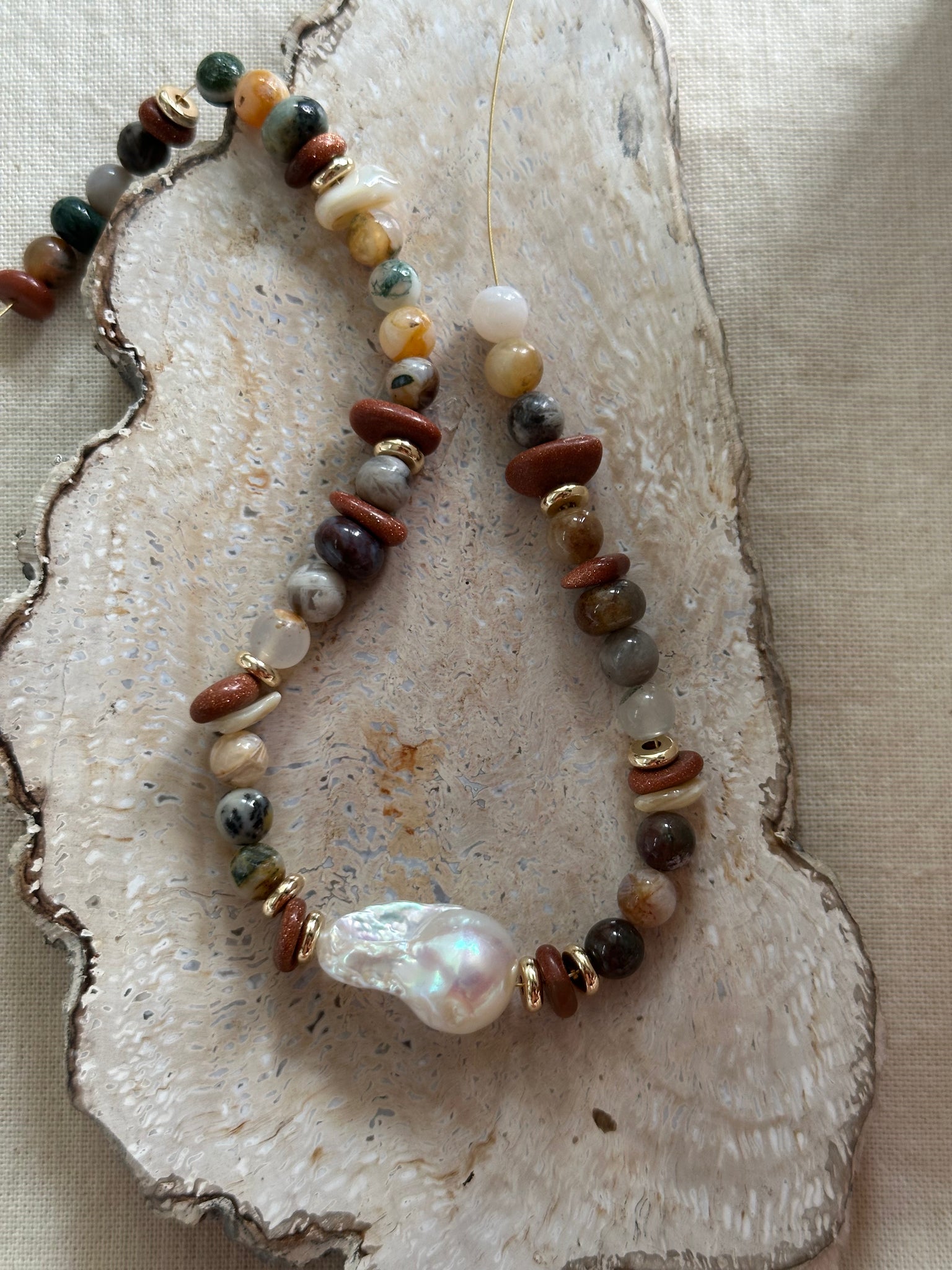 Handcrafted with goldstones, bloodstones  indian agate gold-plated beads and freshwater pearls.