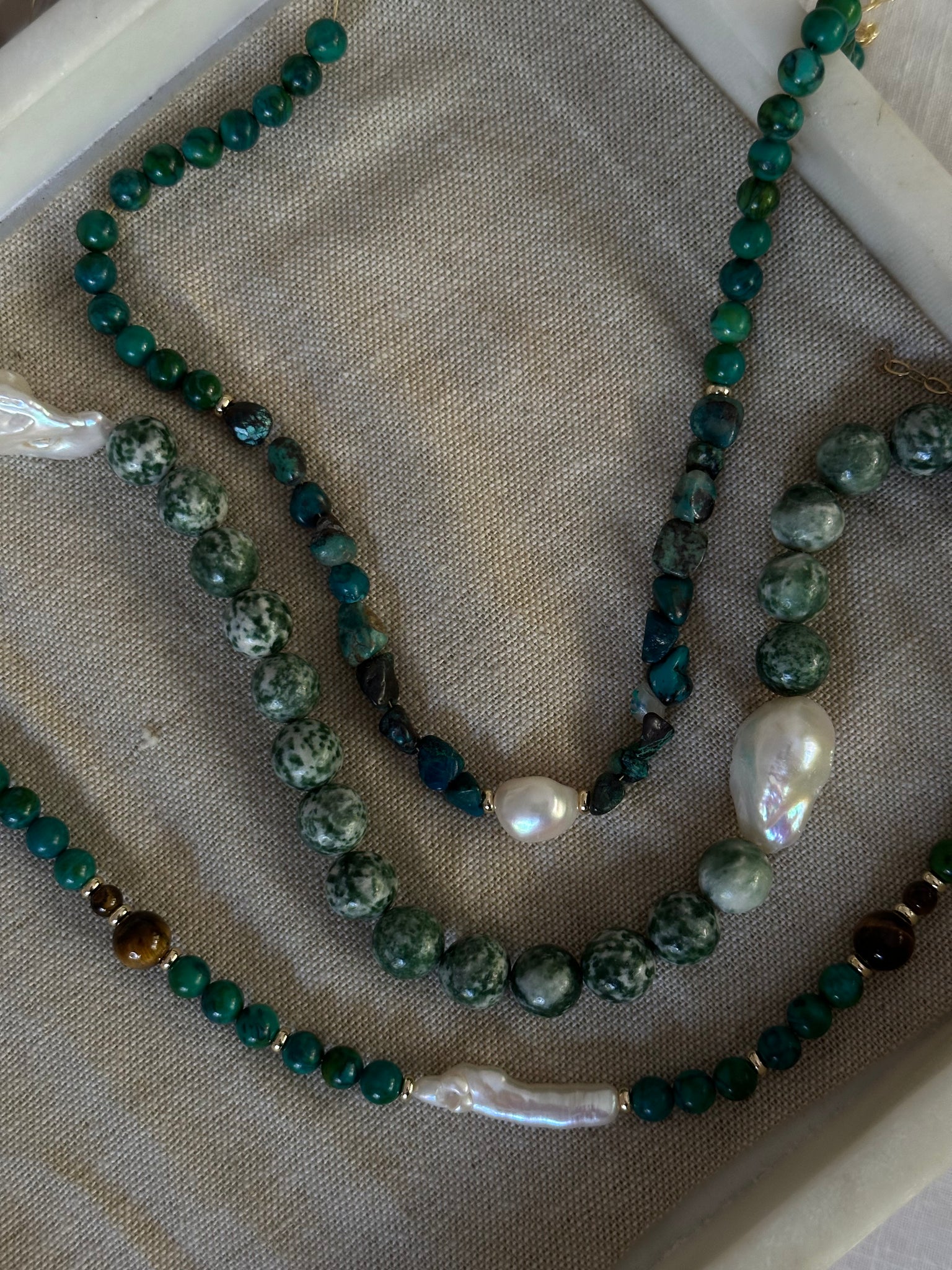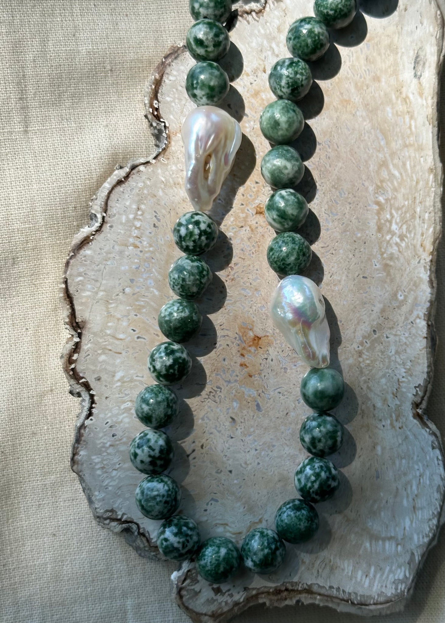 Crafted with grounding green spot jasper and two luminous baroque pearls, Nirvana brings harmony between body, mind, and spirit.